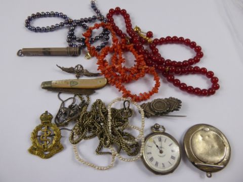 Miscellaneous Silver and Other Jewellery, including brooch, mother of pearl silver bladed pocket knife, a lady's silver pocket watch, seed pearl necklace, coral necklace, Cornelian style necklace, RAF sweet heart badge.