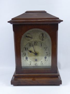 An Oak Mantle Chiming Clock, the clock having a German 18 cms movement, silvered face and Roman dial, approx 18 cms.