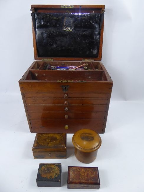 A Mahogany Collection Box, with five drawers together with four boxes, one cylindrical and one stamp box.