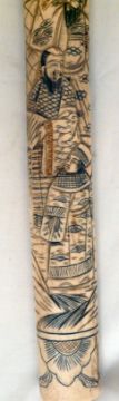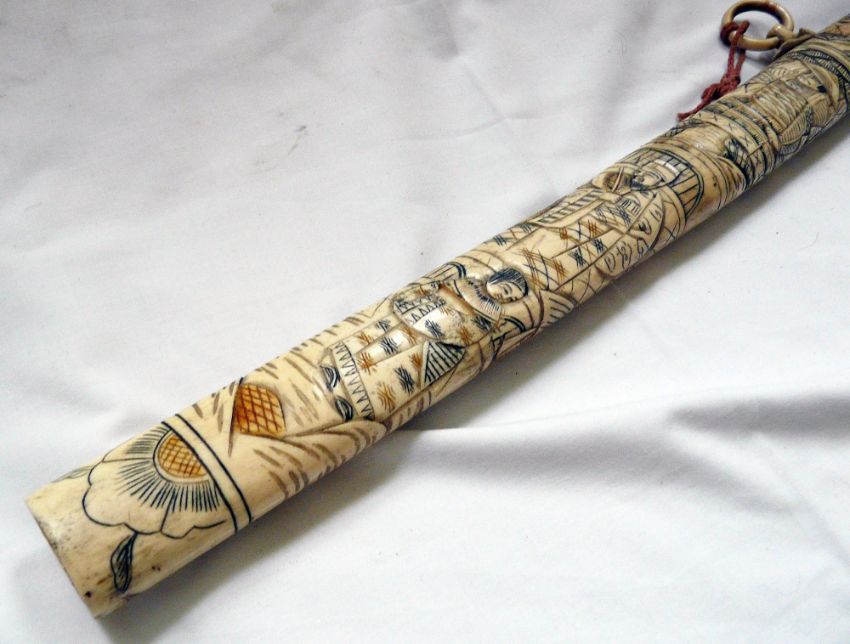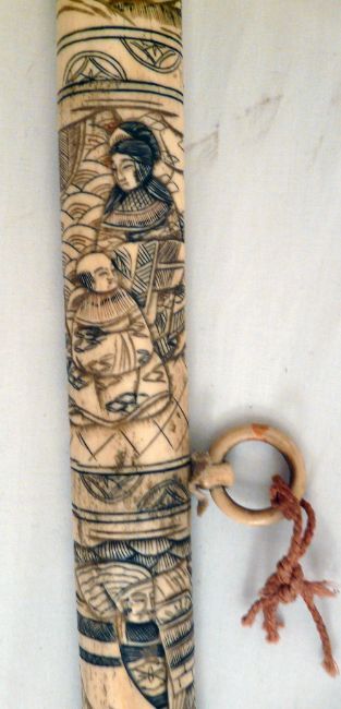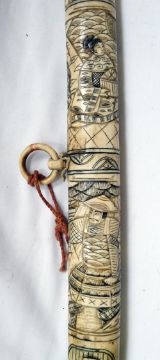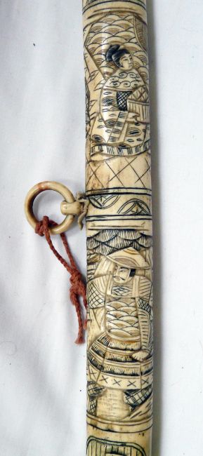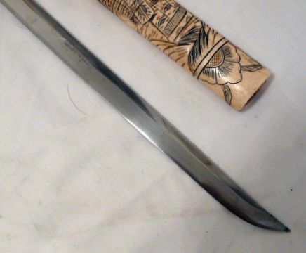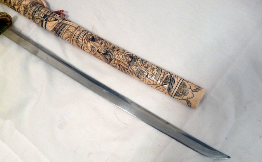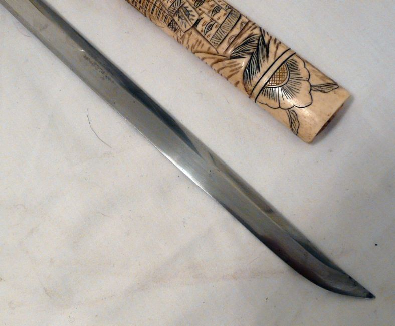 Japanese Wakizashi Sword Bone Scabbard. The hand forged 48 cm blade is of highly polished steel with discernible hamon and fitted with a brass habaki. Overall the Wakizashi measures 76 cms. The carved bone scabbard and grip are decorated with court figures in traditional dress.