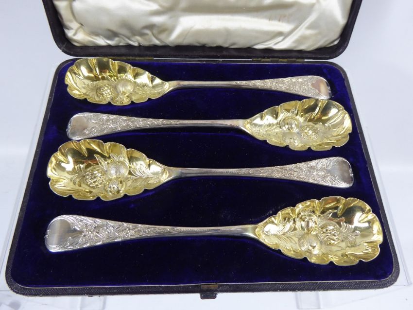 A Set of Four Solid Silver Victorian Berry Spoons, the spoons having gilded bowl, in original Hammond & Inches presentation box, Birmingham hallmark dd 1864, mm J.S. & S., approx wt 330 gms.