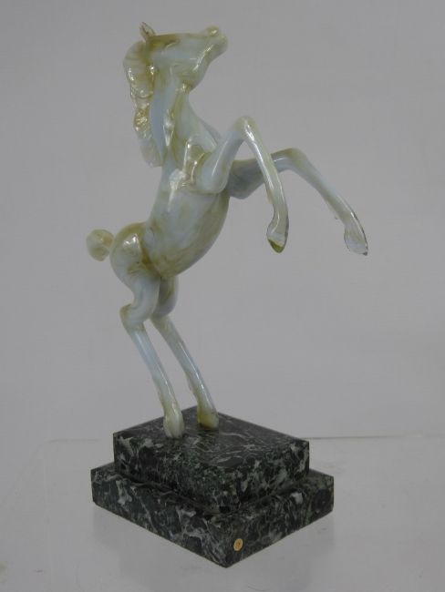 Istvan Komaromy Glass Figure of a Foal, raised on a green marble plinth bearing label, to lower right. Note: Istvan Komaromy was a German born Hungarian whose family glassworks in Budapest continues to produce art glass to this day. In the early 20th Century he settled in England where he opened a studio and produced beautiful examples of glass figurines, he taught at the London Slade School and in Wimbledon.