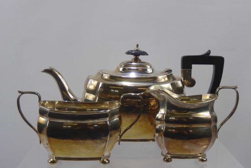 A Silver Tea Set, comprising tea pot, twin handled sugar bowl and milk jug, London hallmark, dated 1938, mm ASW Ltd, approx 1160 gms.