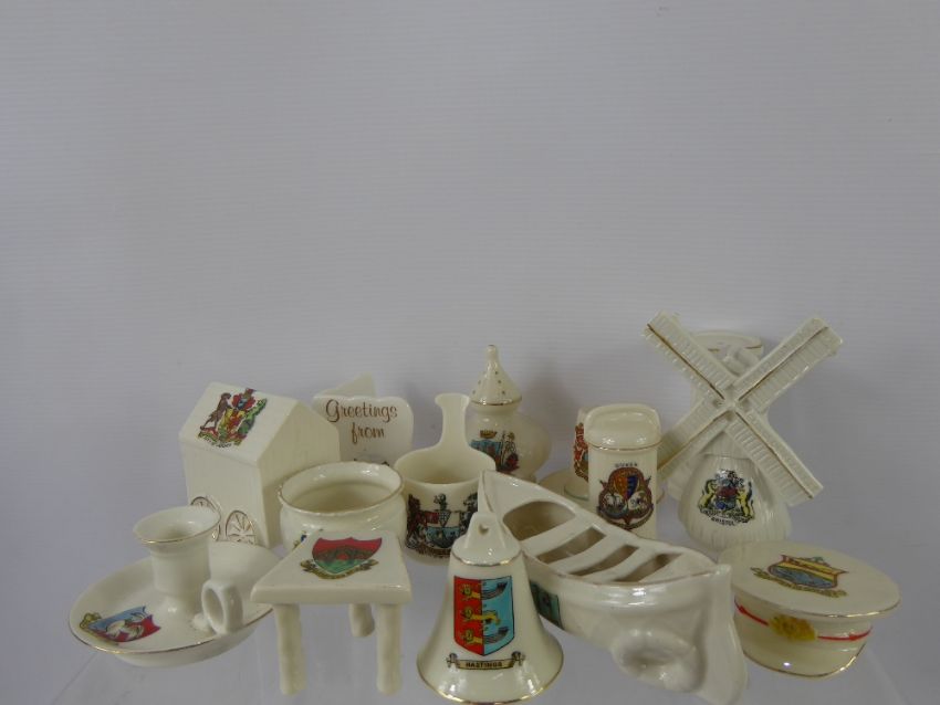 A Quantity of Crested Ware, including Arcadia, Goss, Grafton, Alexandra, Willow Art of various interest, incl lifeboat, toby jug, officers cap, Welsh hat, bell, fire bucket, yacht, pillar, windmill, post office, bathing hut, greeting card, candle holder, hair tidy with a small quantity of pots. (21)