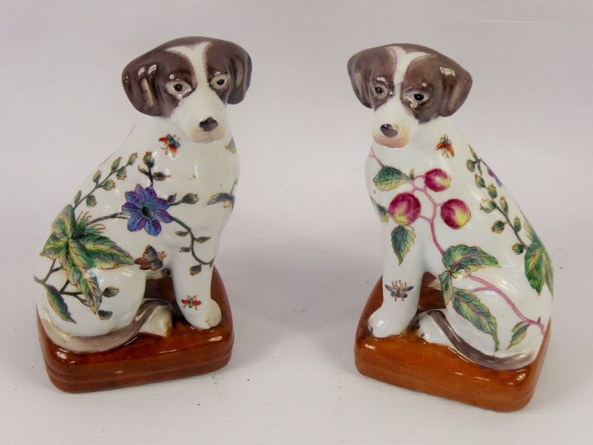 A Pair of Chinese Ceramic Spaniel Figurines, hand painted with fruit and insects, approx 22 cms, with character marks to base.