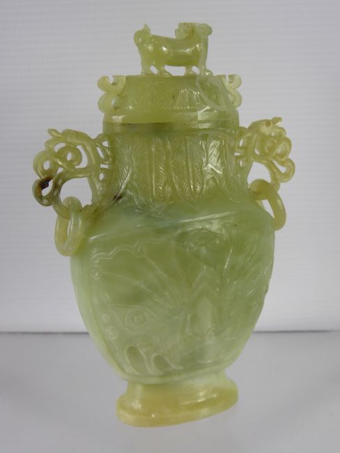Chinese 20th Century Pale Celadon Jade Vase and Cover. The vase carved with Taotie in shallow relief to either side, The cover features a Fo Dog. Approx 15 cms (6") h. AF