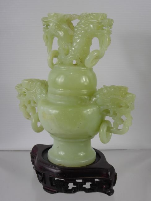 Chinese 20th Century Caledon Jade Censer, the censer having dragon mask and ring handles with twin ringed finial to domed cover, on pedestal foot. 17 cms (6 3/4") h. AF