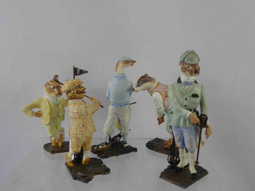 Five David Geenty Wind in the Willows Animal Sporting Figures, approx 17 cms (af) Stoat, Badger, Weasel, Rat, stamped Alderney England.