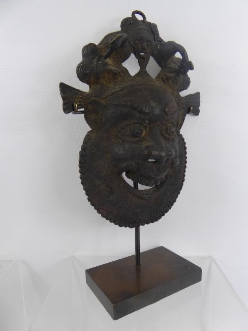 Bamileke Cameroon Antique Cast Copper Alloy/Bronze Mask, depicting an elated character, exaggerated features, striated collar with beaded decoration, crowned with elaborate headdress depicting feeding crane and fish, central loop suggesting suspension, approx 36 x 25 cms
