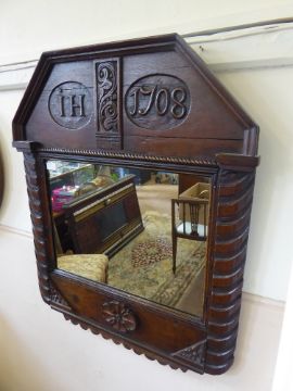 A Mahogany Framed Hall Mirror, the mirror carved with monogram IH and dated 1708 to the upper portion and a floral motif to the lower portion of the frame, approx 80 x 72 cms