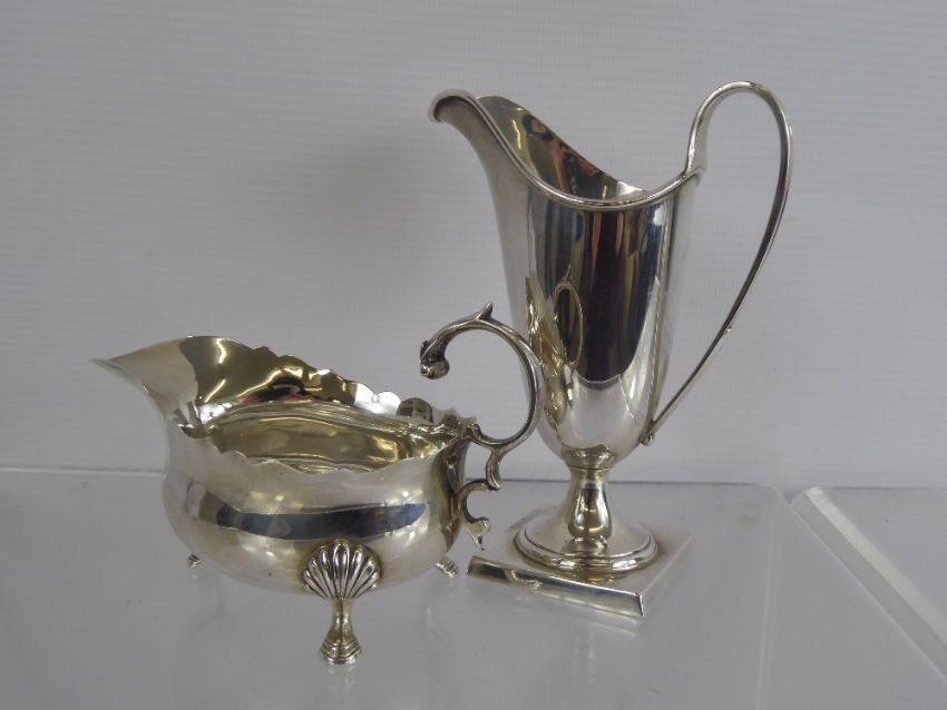 A Solid Silver Helmet-Shaped Cream Jug, Sheffield hallmark dated 1961, mm EV, together with a solid silver sauce boat on shell-form hoof feet, London hallmark dated 1929, mm EBs, approx wt 216 gms.