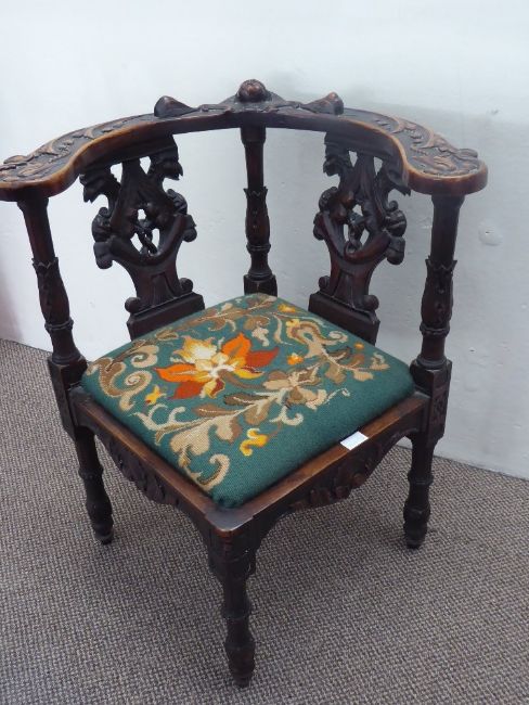 An Antique Oak Corner Chair, with elaborate carving to chair back and arm rests.