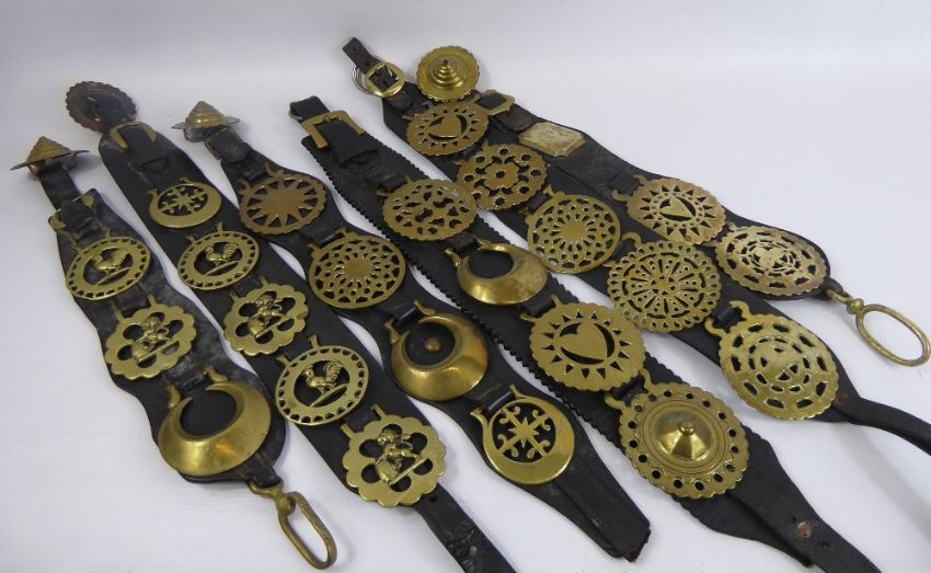 A Miscellaneous Collection of Seven Martindale Leathers, with horse brasses, approx 27 brasses in total.