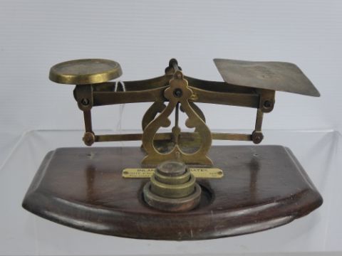 A Set of Vintage Brass Postal Scales, with a small quantity of weights.