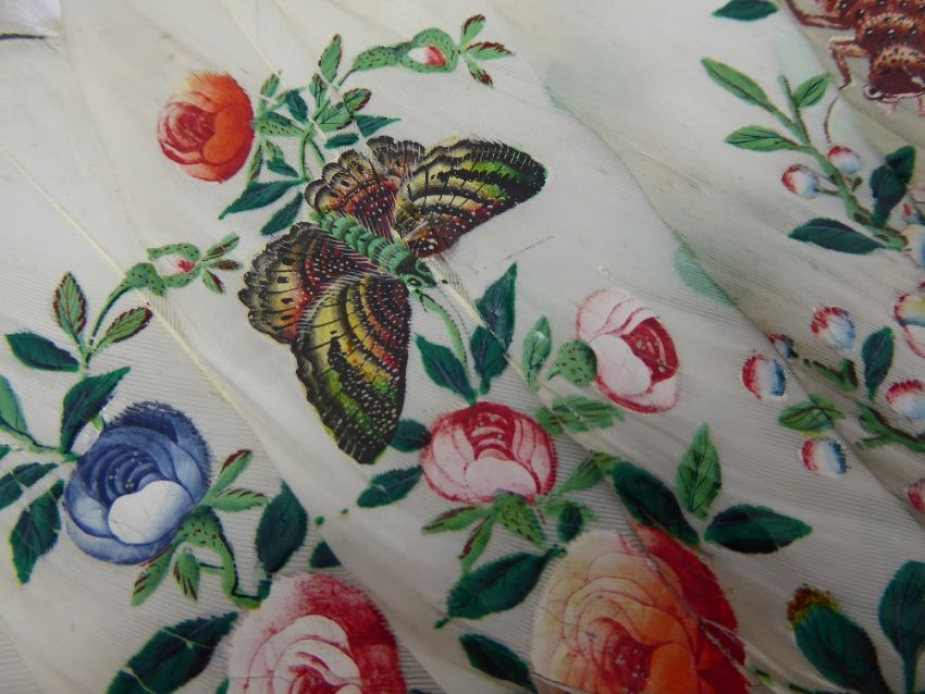 A 19th Century Chinese Ivory and Feather Fan, hand painted with flowers and butterflies to one side, verso hand painted with roses and insects, central cartouche depicting figures at leisure, pierced ivory sticks with decorative carving to stick guard, approx 47 x 30 cms