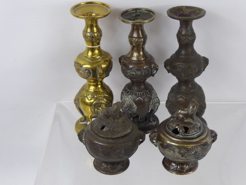 A Collection of Brass and Other Metal Items, including candlesticks and bronze sensors. (5)