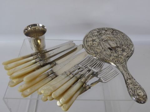 A Silver Continental Hallmark Beaker, together with a set of six mother of pearl knives and forks and a silver hand mirror Birmingham hallmark circa 1908.