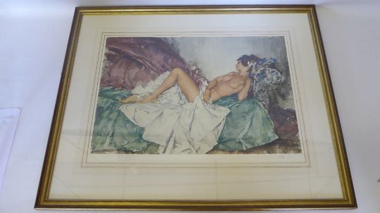 Sir Russell Flint, a limited edition print, depicting a reclining nude, nr 215/850 approx 71 x 87 cms, glazed and framed.