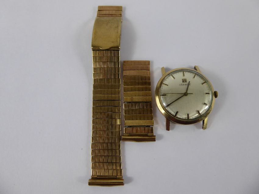 A Gentleman's 9ct Gold Vintage Tissot Wrist Watch together with a 9 ct gold strap, the watch having a silvered face with baton markers, case nr 11001, movement nr 12133366, approx 32 gms without watch.