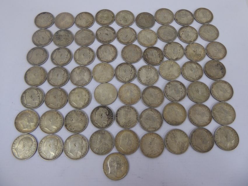 A Collection of Indian Silver One Rupee Coins, including 1 x 1900, 5 x 1903, 8 x 1904, 3 x 1905, 17 x 1906, 12 x 1907, 2 x 1908, 1 x 1909, 3 x 1910, 2 x 1912, 4 x 1913, 1 x 1914, 2 x 1916, 1 x 1918, 2 x 1919, total 64, approx wt 750 gms.