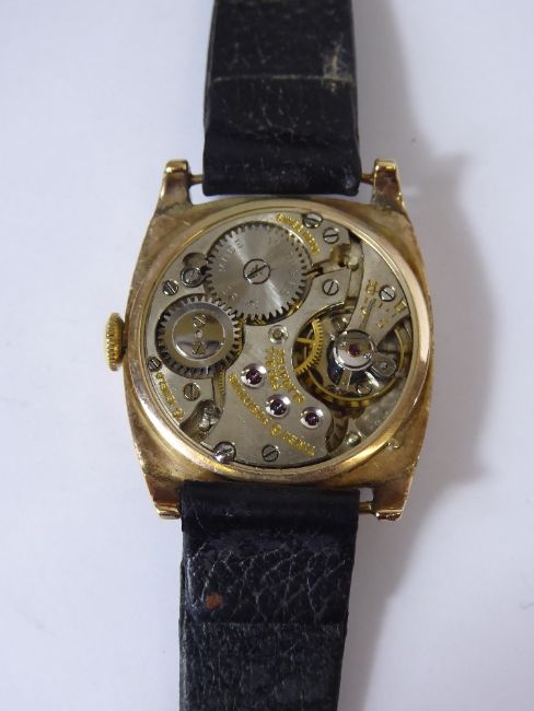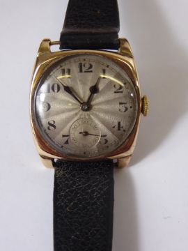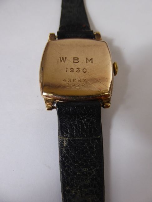 A Gentleman's 9 ct Gold Vintage Rolex Wrist Watch. The watch having an engine turned face with minute dial, case nrd 43687, 1928, and engraved W.B.M. 1930, approx 22 gms