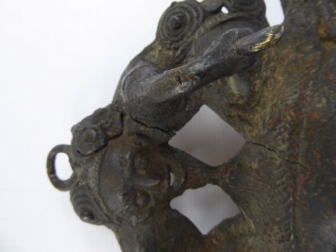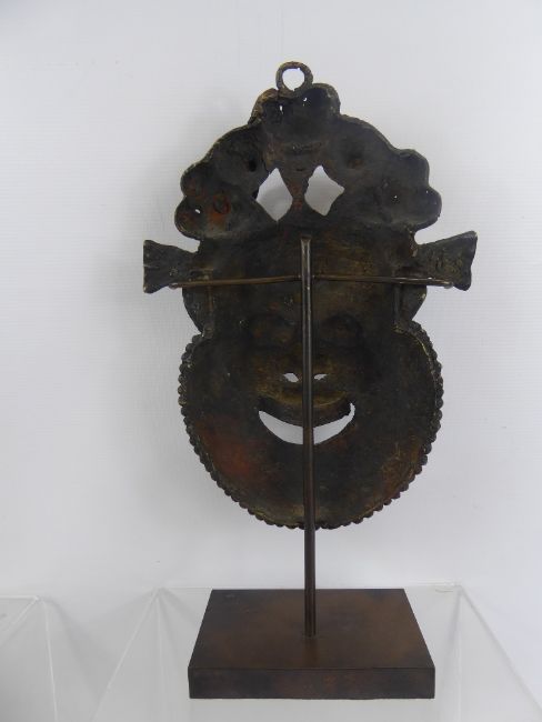 Bamileke Cameroon Antique Cast Copper Alloy/Bronze Mask, depicting an elated character, exaggerated features, striated collar with beaded decoration, crowned with elaborate headdress depicting feeding crane and fish, central loop suggesting suspension, approx 36 x 25 cms