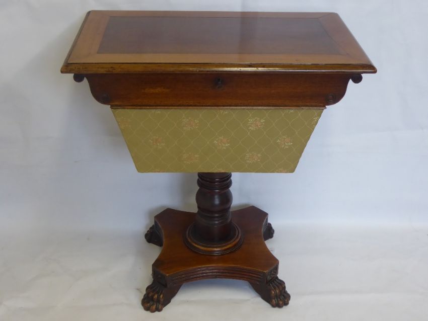 An Antique Rosewood and Mahogany Sewing Box, on claw feet with turned central pedestal, approx 73 x 44 x 75 cms.