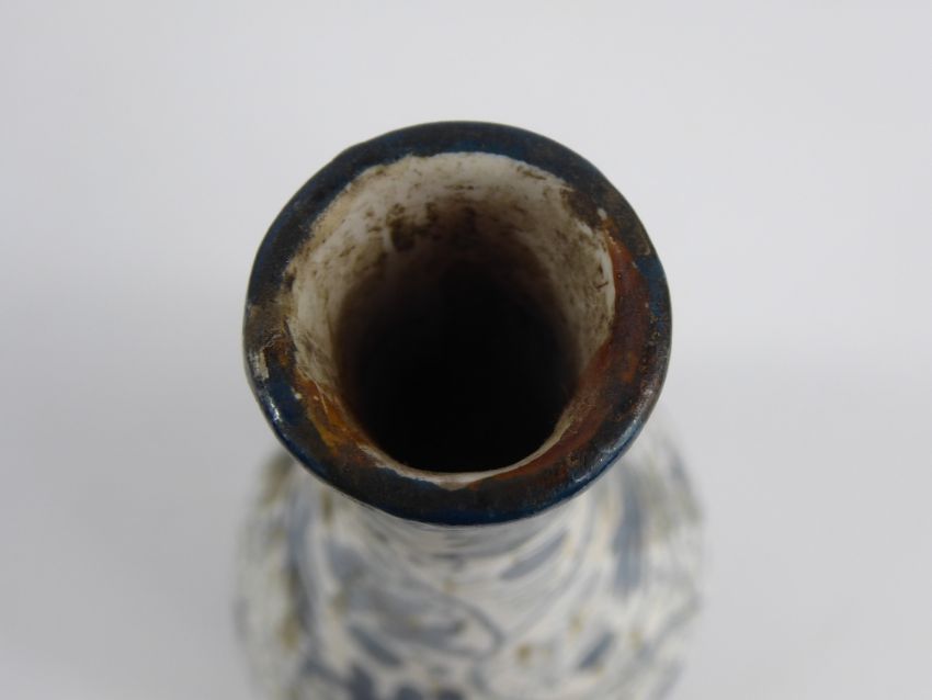 An Early Earthenware Italian Florentine/Tuscan Majolica Bottle, the small oil or scent bottle, hand decorated with an oak-leaf design on foliate scroll, of an unusual green palette, approx 19 cms (af) Provenance: Property of an Italian lady, originally from Rome, the scent bottle belonged to her great grandmother.