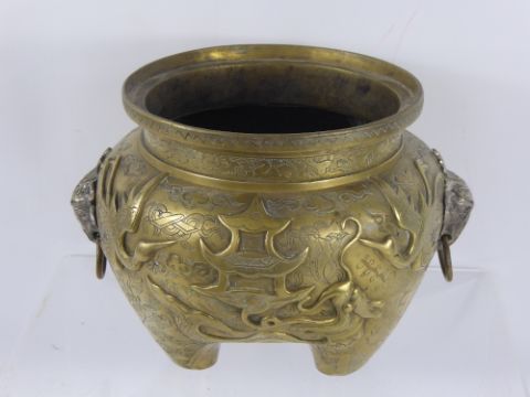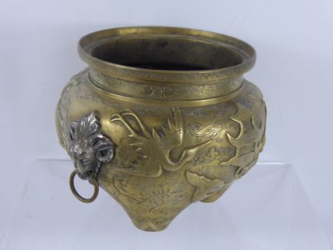 An Antique Brass Censer, the censer having raised dragons chasing a pearl and with applied white metal ram's head handles, approx 17 cms high.