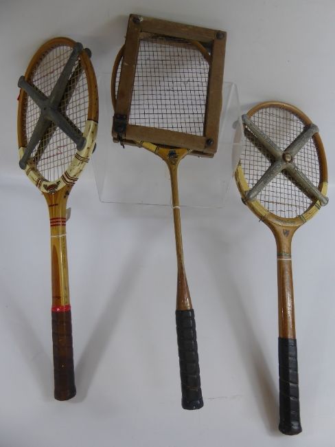A Pair of Vintage Tennis Rackets, complete with stretchers, incl Dunlop Fort, Cambridge Treble Blue and a Kenton badminton racket. (3)