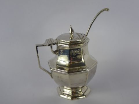 A Silver Mustard, London hallmark dated 1891, with the original blue liner together with mustard spoon dated 1860, approx 112 gms (2)