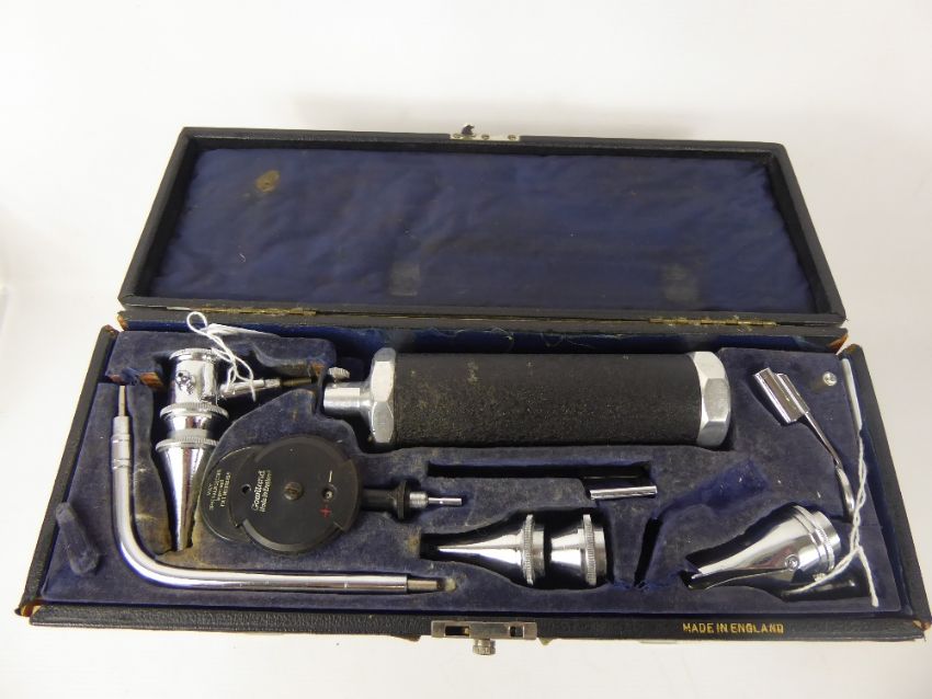 A Gowlland England Ophthalmoscope, in a fitted case together with two antique hand blown glass vessels. (3)