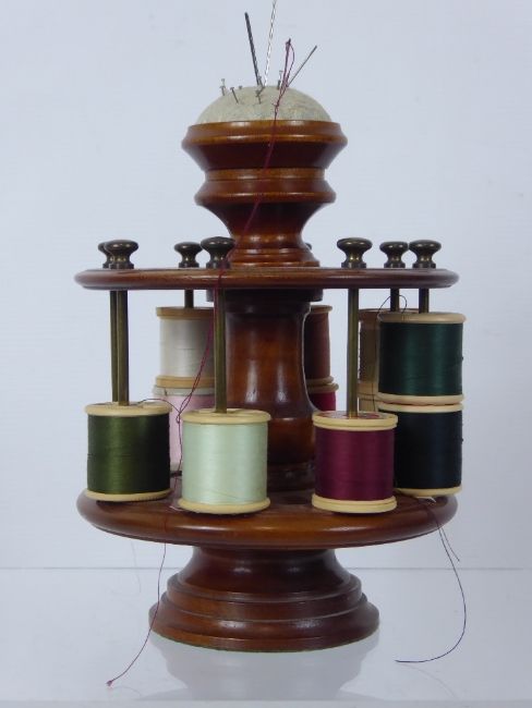 A Wood Turned Cotton Reel Holder, with fitted pin cushion finial, holds approx sixteen spools.