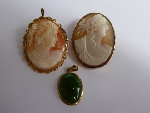 Two Lady's 9ct Yellow Gold Cameo Brooches, approx 3 x 2.5 cms together with a 14 ct green stone pendant, approx 18 x 12 mm (3)