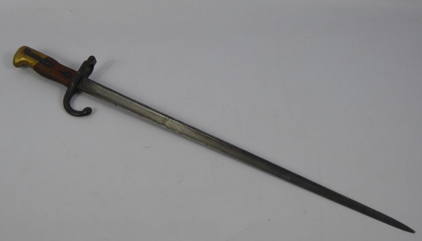 A French 19th Century Military Bayonet, engraved St Etienne Armory stamped 1877, standard pattern with wood and brass grip, engraved markings to back of blade with additional markings to the top of the blade. No scabbard.
