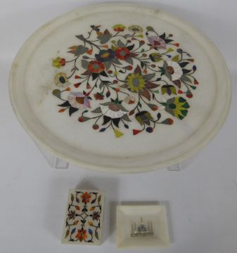 A Large White Marble Plate, with semi-precious stone floral design, 38 cms diameter, a painted marble box containing knife rests and a small rectangular plate depicting Islamic building in mother- of-pearl inlay (3)