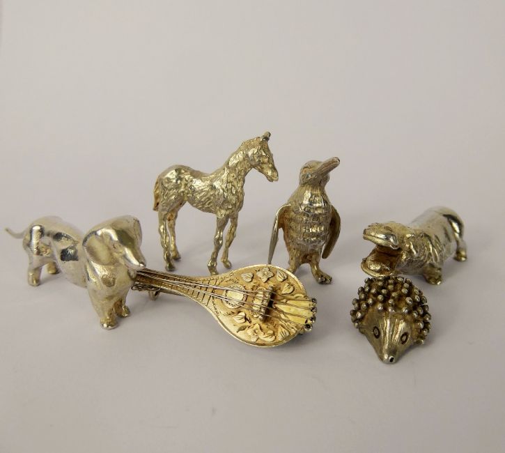 A Quantity of Sterling Silver Miniature Animals, including hedghog, foal, penguin, hippo, dachshund and a mandolin.