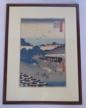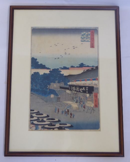 Ando Hiroshige (Japanese,1797-1858) Antique woodblock print from the 100 Views of Edo Series entitled 'The Yamashita District of Ueno', approx 22 x 35 cms, framed and glazed.