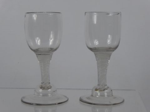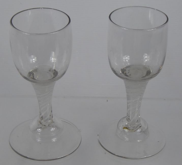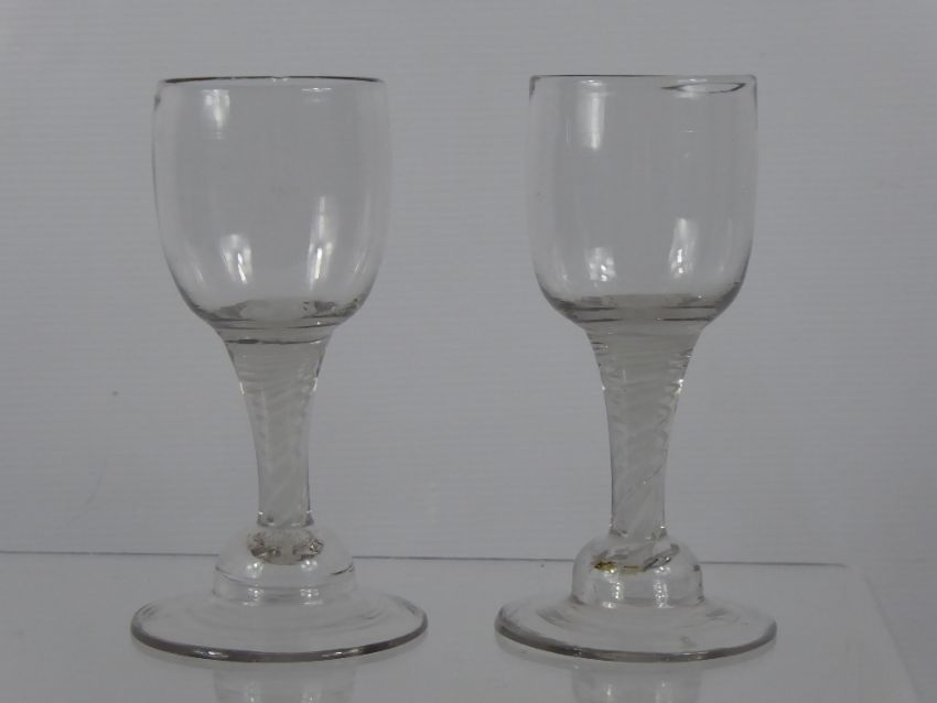 A Pair of 18th Century Ribbon Glasses, with a round funnel bowl, ribbon stem on conical foot, height 14.5cm.