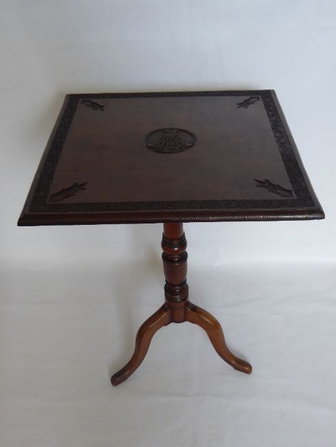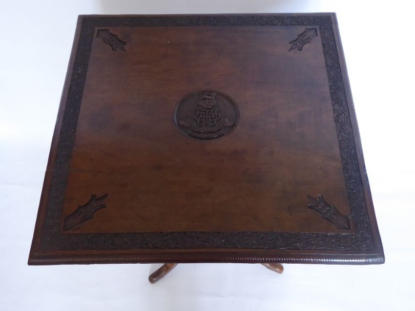 An Oak Tilt Top Table Inscribed Duke of Connaught, the table having carved with floral border, insignia to each corner, carved central cartouche VII RAJPUTS,cms and having turned column on tripod base, approx 52 x 52 x 77
