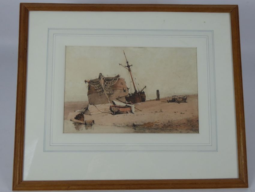 An Early 19th Century Lithographic Print of Coastal Scenes, with 'man o war' hull and other vessels,, approx 29 x 19 cms.