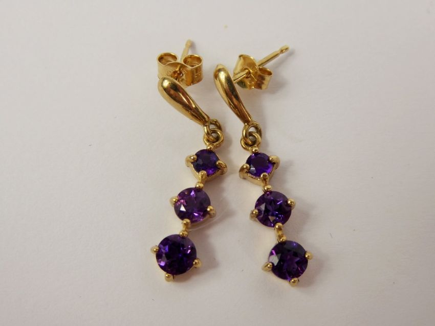 A Pair of Lady's 9ct Gold and Amethyst Three Stone Earrings, amethysts 3.5 mm - 4.5 mm, approx 2.3 gms