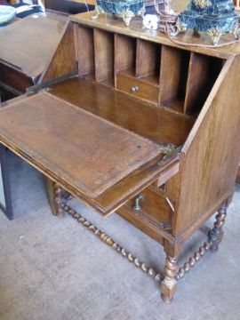 A Small Oak Drop-Front Writing Desk, fitted interior, with two drawers, raised on barley-twist stretchers, approx 29 x 40 x 98 cms