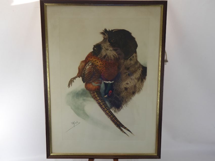 Limited Edition Print Bryan Hanlon, entitled 'Spring Cleaning' nr 201/850, approx 45 x 36 cms, framed and glazed, publishers stamp lower left together with a print of a dog and pheasant. (2)