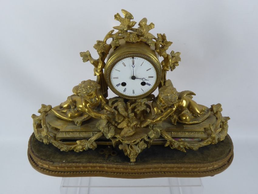 A French Bronze Gilt Mantel Clock, inset with painted porcelain panels, floral garland and two cherubs feeding a swan, white enamel face and Roman dial. Eight day movement, strikes on a bell, retailer Payne & Co., 165 New Bond Street, London.