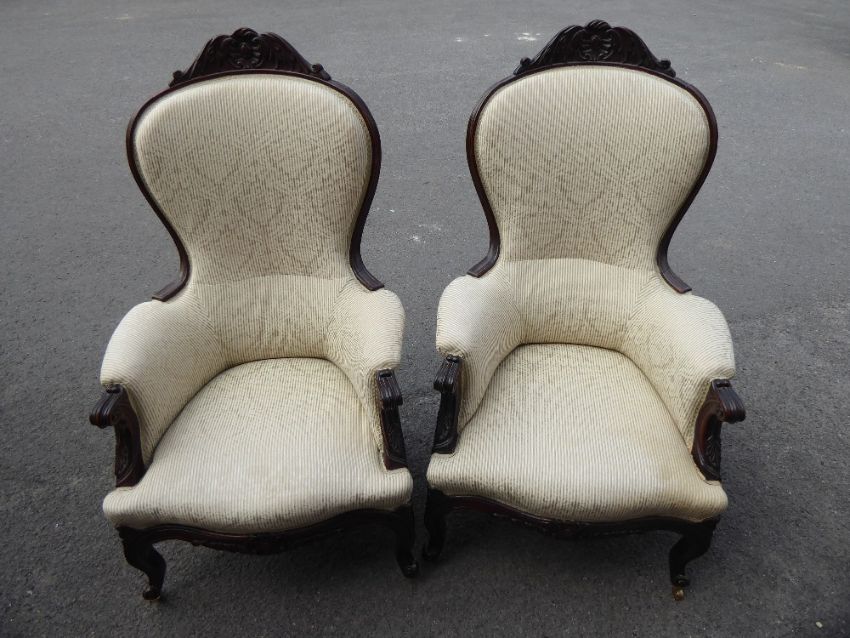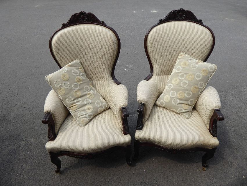 A Pair of Victorian Arm Chairs, with carving to arms and legs, serpentine fronted.
