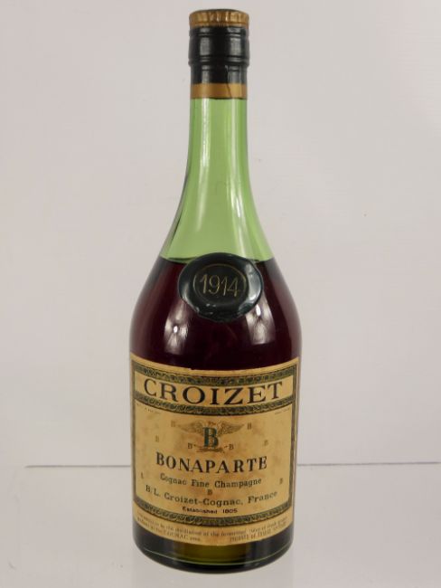 A Bottle of Fine Croizet Champagne Cognac, bottle dd 1914, 70 proof, wax shoulder button is intact.