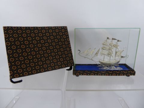 A Silver Filigree Model of a Sailing Ship, housed within a square glass cover and presentation box.