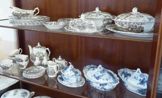 A Royal Semi Porcelain "Princess Pattern" Booths, England R No. 183173/3 Dinner Service, comprising two lidded tureens, sauce boat and saucer, together with a part dinner service "Royal Mail" Fine Staffordshire Ironstone comprising two lidded tureens, sauce boat with saucer, lidded butter dish, small bowl, meat platter, five dinner plates, five side plates, five teacups and saucers, teapot, milk jug, sugar bowl and salt and pepper.