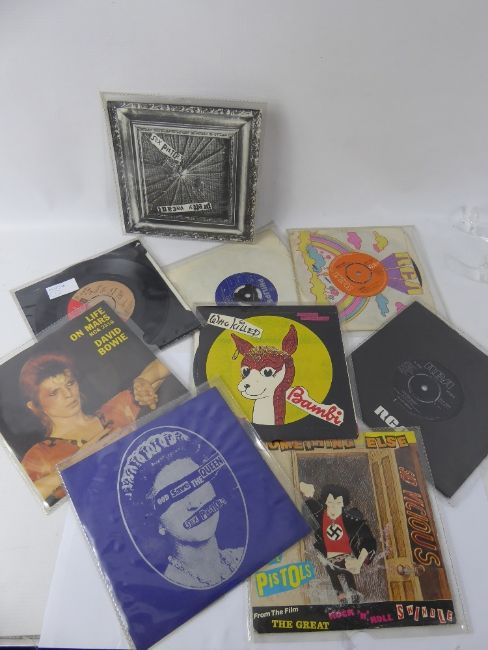 Nine 7" Records, including three RCA David Bowie 1971 2 x "Life on Mars", David Bowie 1972 "Changes", Philips David Bowie 1969 "Space Oddity", 4 x Virgin 1979 Sex Pistols "Something Else", 1979 "Who Killed Bambi", 1977 "God Save the Queen", 1977 Virgin "Pretty Vacant" and EMI 1976 Black Sleeve "Anarchy in the UK, nr 2566.